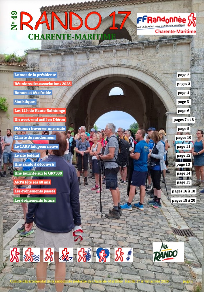 Revue N°49 (Janvier 2026), éditée par le Comité départemental de Randonnée Pédestre de Charente-Maritime, au format PDF.